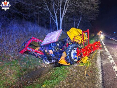 Rozbity ciągnik na „krajówce”. Trzy osoby w szpitalu