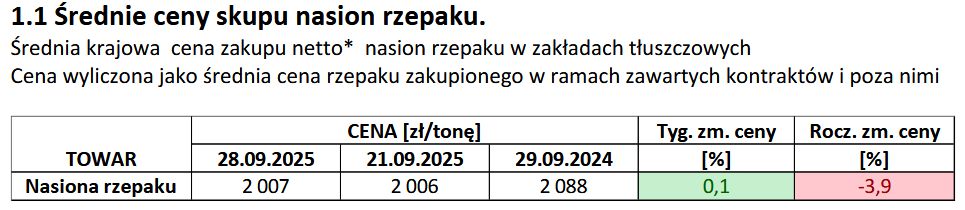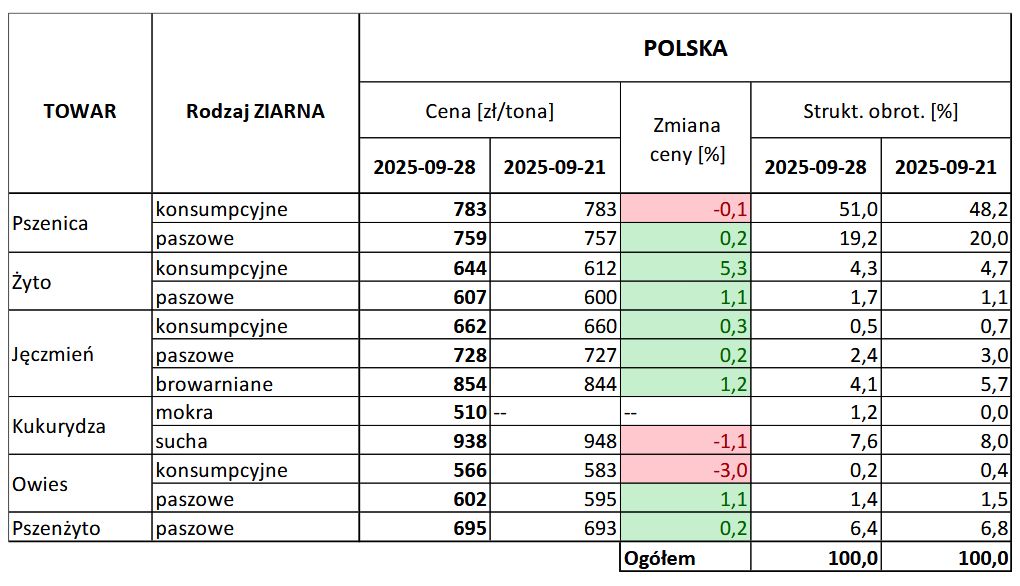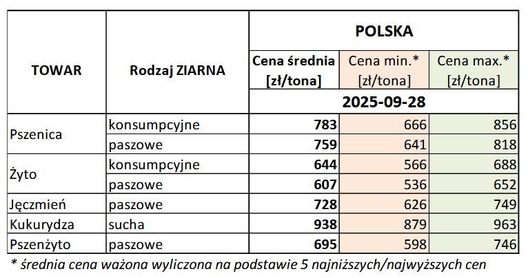 Według ZSRIR, średnie krajowe ceny zakupu ziarna w przedsiębiorstwach skupujących wyglądają tak: