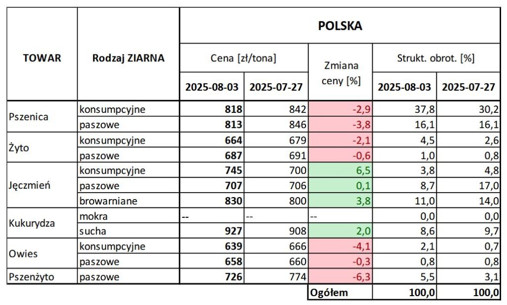 Ogółem ceny zbóż w porównaniu do poprzedniego zestawienia cen autorstwa resortu rolnictwa (z 1 sierpnia) zmieniły się niewiele, z tendencją ku spadkom. Trzeba tu jednak pamiętać, że trwają żniwa, podczas których zazwyczaj nie ma się co spodziewać wielkich ruchów w skupach – zarówno towarowych, jak i cenowych.