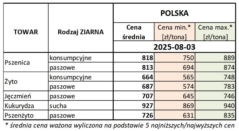 I tak np. cena pszenicy konsumpcyjnej (stan na 3 sierpnia) wahała się od 750 do 889 zł za tonę, a paszowej – od 694 do 874 zł/t. Średnia cena pszenicy to odpowiednio 818 i 813 zł/t.