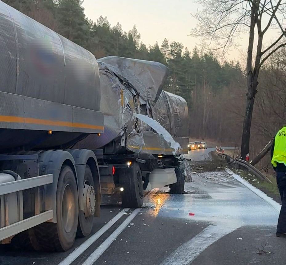 Funkcjonariusze z Komendy Powiatowej Policji w Mrągowie (woj. warmińsko-mazurskie) wczesnym rankiem w sobotę (29 marca) zostali wezwani do zdarzenia na drodze krajowej nr 59 między Pieckami i Mrągowem. Jak się okazało, zestaw ciężarowy (ciężarówka z przyczepą) przewożący mleko uderzył tam w drzewo i bariery energochłonne. Wywołane tym uszkodzenia cysterny skutkowały wyciekiem ładunku.