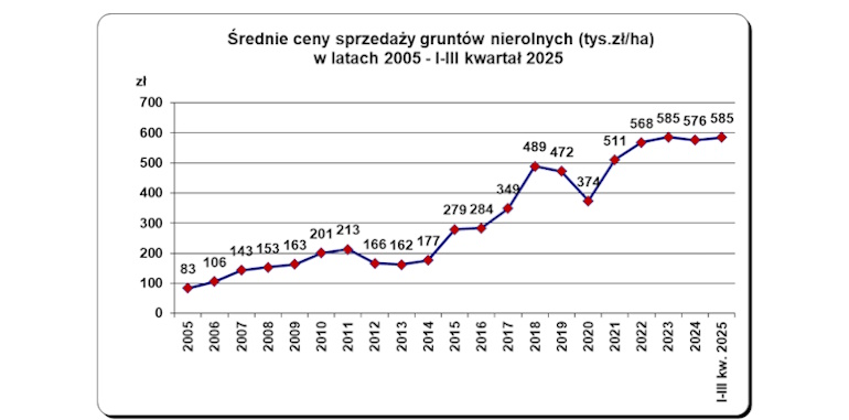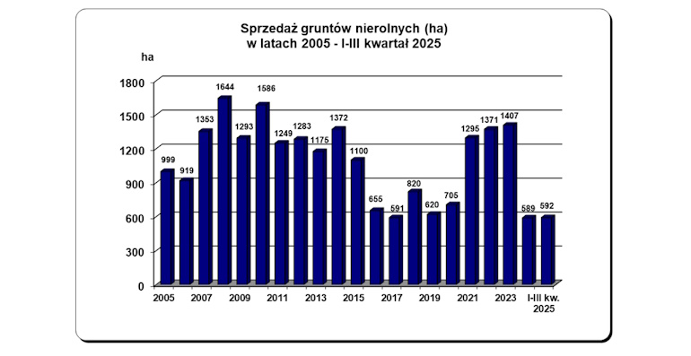 W trzech pierwszych kwartałach 2025 r. powierzchnia sprzedaży gruntów nierolnych wyniosła 592 ha. Jest ona o 249 ha większa w stosunku do sprzedaży w analogicznym okresie 2024 r. Z przeprowadzonych niemal 1,1 tys. transakcji sprzedaży w miesiącach I–IX.2025 r. uzyskano kwotę 346,5 mln zł. Średnia cena sprzedaży 1 ha gruntów nierolnych wyniosła w tym okresie 584,9 tys. zł.