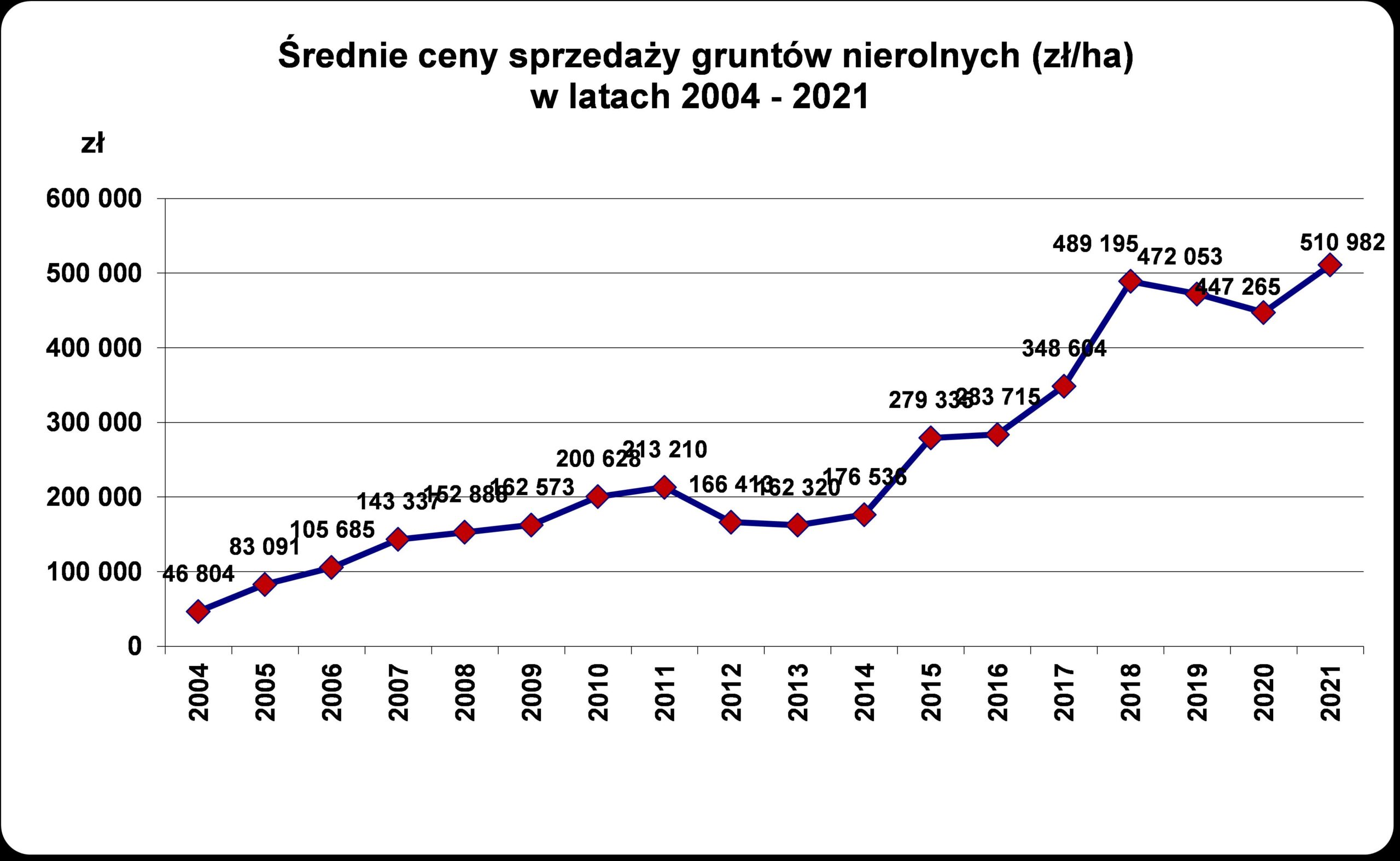 W latach 2016–2020 Krajowy Ośrodek Wsparcia Rolnictwa sprzedawał nieruchomości nierolne na poziomie od 600 do 800 ha. A roczne kwoty ze sprzedaży terenów inwestycyjnych w tym okresie to ok. 250-400 mln zł. Natomiast w 2021 r. KOWR sprzedał 1295 ha gruntów nierolnych za kwotę 667,3 mln zł. W tym celu zawarł 2158 transakcji. Średnia cena sprzedaży 1 ha gruntów nierolnych wyniosła 511 tys. zł.