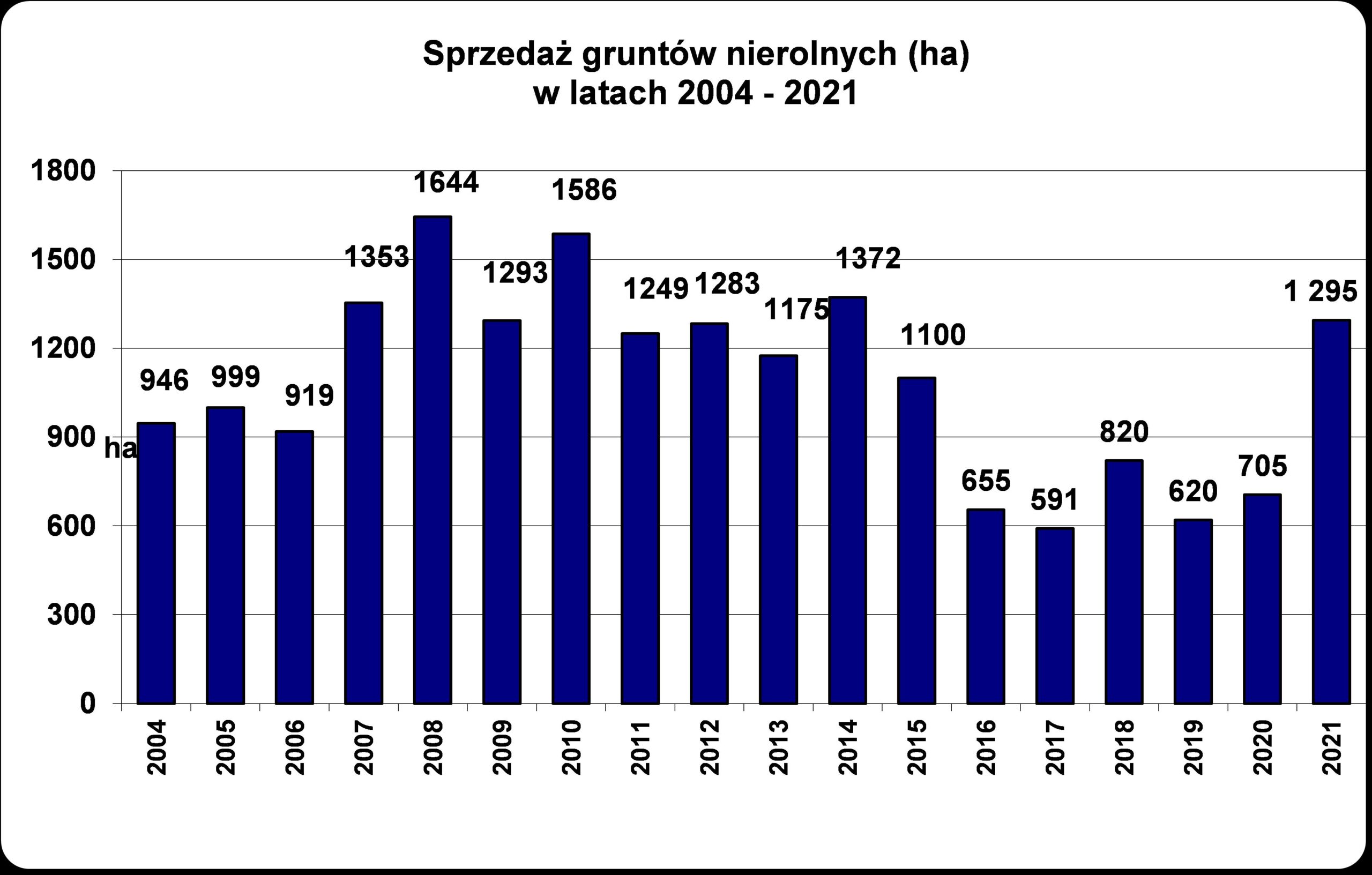 Najwięcej gruntów nierolnych w 2021 r. sprzedano w OT w Gorzowie – 237 ha, w OT w Olsztynie – 207 ha i w OT w Częstochowie – 150 ha, następnie w OT w Pruszczu Gdańskim – 108 ha, w OT w Opolu – 104 ha i w OT we Wrocławiu – 102 ha. Razem w tych 6 oddziałach sprzedano 907 ha, co stanowi 70% sprzedanych gruntów nierolnych ogółem.