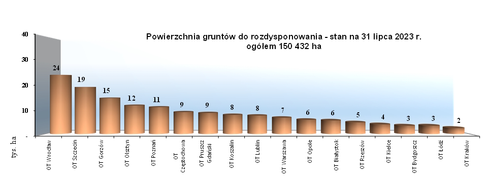 Według stanu na koniec lipca 2023 r. do rozdysponowania pozostawało 150,4 tys. ha nieruchomości Zasobu WRSP. Największymi powierzchniami pozostającymi do rozdysponowania dysponują oddziały terenowe: we Wrocławiu i Szczecinie.