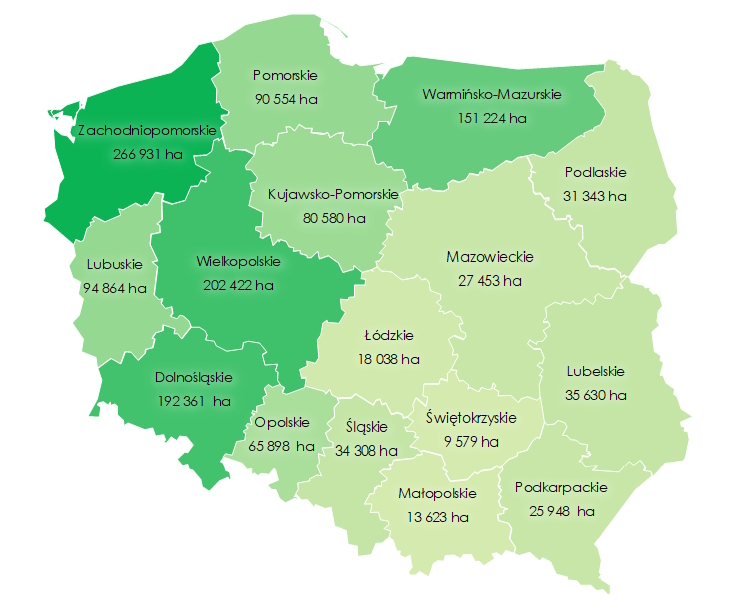 Według stanu na koniec lipca 2023 r. w dzierżawie pozostawało ponad 1 mln 83 tys. ha. Największe powierzchnie wydzierżawionych gruntów znajdują się w województwach: zachodniopomorskim – 223,6 tys. ha; wielkopolskim – 164,8 tys. ha; dolnośląskim – 157,2 tys. ha i warmińsko-mazurskim – 131,6 tys. ha. W siedmiu miesiącach br. wydzierżawiono ogółem prawie 20,4 tys. ha gruntów.