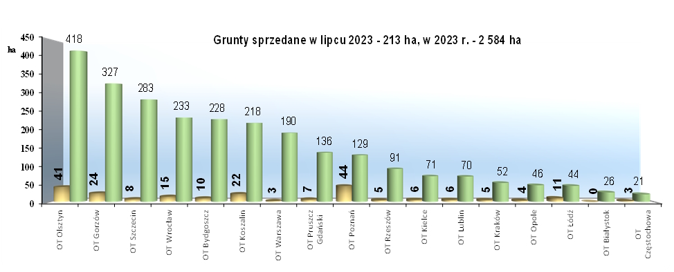 Inną formą gospodarowania Zasobem Własności Rolnej Skarbu Państwa jest sprzedaż. W pierwszych siedmiu miesiącach 2023 r. zrealizowana sprzedaż nieruchomości Zasobu WRSP wyniosła niemal 2,6 tys. ha. Najwyższą odnotowano w Olsztynie – 418 ha, Gorzowie – 327 ha i Szczecinie – 283 ha.