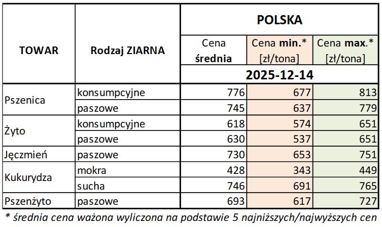 Średnie, krajowe ceny zakupu ziarna w przedsiębiorstwach skupujących zboża wyglądają według ZSRIR tak: