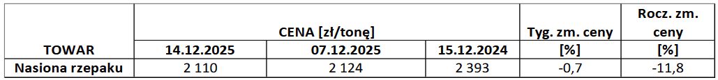 Średnia krajowa cena zakupu (netto) nasion rzepaku w zakładach tłuszczowych (w ramach zawartych kontraktów i poza nimi) to według ZSRIR: