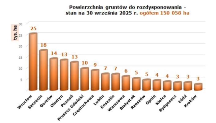 Według stanu na koniec września 2025 r. do rozdysponowania pozostało nieco ponad 150 tys. ha nieruchomości Zasobu WRSP. Największymi powierzchniami dysponują Oddziały Terenowe: we Wrocławiu, Szczecinie, Gorzowie Wlkp., Olsztynie i Poznaniu – łącznie 55% powierzchni pozostającej do rozdysponowania.