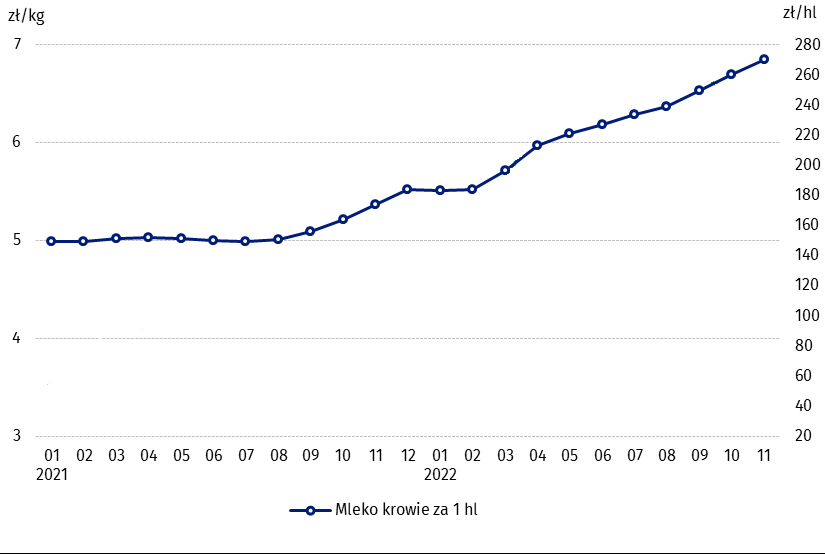 Cena mleka w listopadzie, która średnio w Polsce wyniosła 270,46 zł/hl, była o 3,9% wyższa niż w październiku (260,35 zł/hl) oraz o 55,8% niż przed rokiem, kiedy wynosiła ona 173,64 zł za hl.