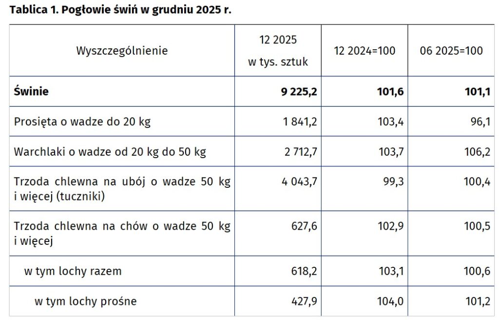 Pogłowie świń w grudniu 2025 r. dotyczące warchlaków i prosiąt w porównaniu z 2024 rokiem zmieniło się. Wzrósł udział tych zwierząt. Zmniejszył się natomiast udział trzody kierowanej na ubój. Dlatego możliwa pozostaje większa podaż w kolejnych kwartałach.