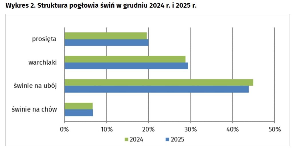 W strukturze stada w grudniu 2025 roku dominowała trzoda o wadze 50 kg i więcej przeznaczona na ubój, która stanowiła 43,8% pogłowia. Warchlaki odpowiadały za 29,4%, natomiast prosięta do 20 kg za 20,0%. Trzoda przeznaczona na chów stanowiła 6,8% ogółu.