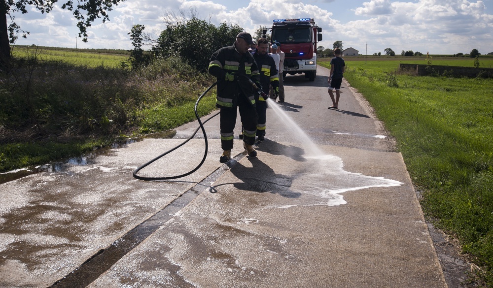 Strażacy rozkładają maty odkażające w miejscowości Truskolasy-Lachy na Podlasiu. Foto_PAP/Michał Zieliński