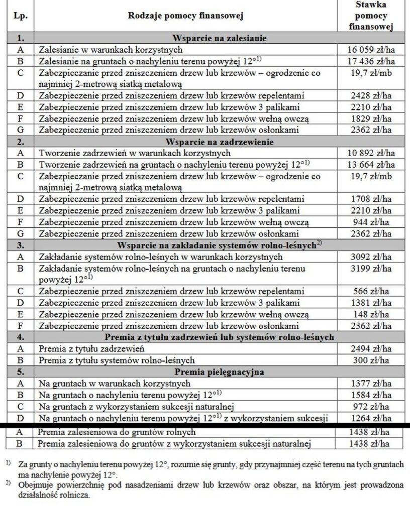 Wysokość stawek pomocy finansowej w ramach wsparcia inwestycji leśnych lub zadrzewieniowych wygląda tak (całość w poniższym załączniku):
