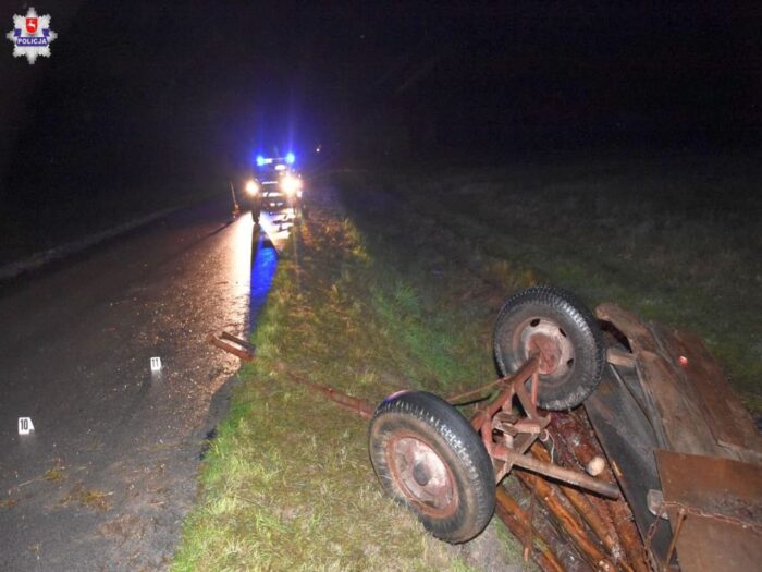 W Aleksandrowie (woj. lubelskie) odpięty od ciągnika wóz wypełniony drewnem wywrócił się i przygniótł podróżującego na nim 49-latka, powodując śmiertelne jak się okazało obrażenia. Wskazywany jako kierowca traktora mężczyzna był pijany.