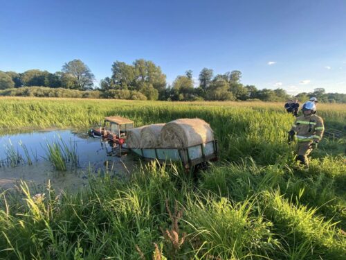 Traktor wjechał do stawu, na pomoc ruszyli strażacy z OSP