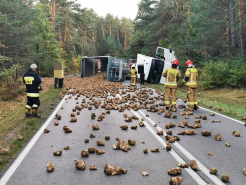 Za szybko na zakręcie. Buraki z wywróconej ciężarówki zablokowały ruch