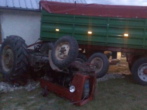 Ciągnik rolniczy marki Ursus z podpiętym rozrzutnikiem jednoosiowym, na którym umieszczone były 3 tzw. mauzery wypełnione wodą wywrócił się na stromym zboczu pola. Kierujący maszyną mężczyzna zginął na miejscu.