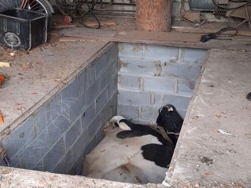 Krowa znowu w kanale naprawczym. Gospodarz wezwał na pomoc strażaków