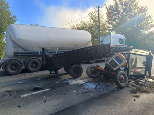 Groźnie na „krajówce”. Ciągnik zdemolowany przez ciężarówkę