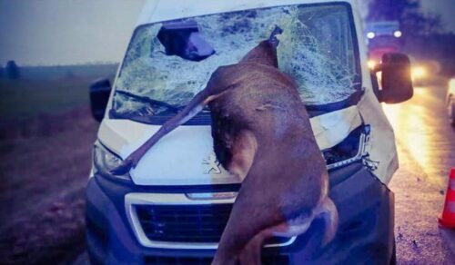 Jeleń wbił się do wnętrza peugeota. Kierowca w szpitalu