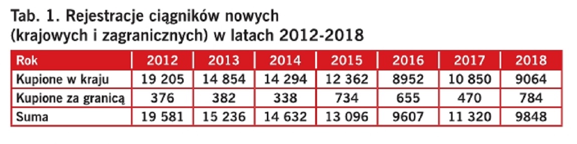 Poza wspomnianymi 9064 ciągnikami nowymi kupionymi w Polsce w 2017 r. – 784 zostało sprowadzonych jako nowe z zagranicy i również zarejestrowanych. To o 314 sztuk więcej niż w roku 2017. Udział tej formy zakupu w rynku nowych traktorów wyniósł prawie 8%. W sumie liczba wszystkich zarejestrowanych w 2017 r. w Polsce traktorów nowych wyniosła 9848 szt. (tab. 1).