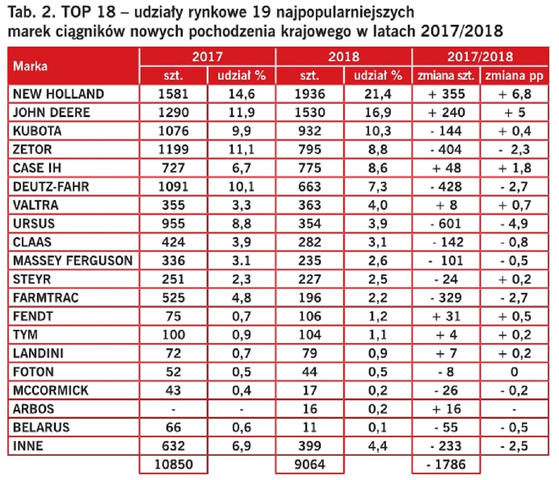 Pomiędzy czwartego Zetora, a szóstego Deutz-Fahra w 2018 r. wskoczyła marka Case IH z rejestracjami wynoszącymi 775 ciągników, co oznacza wzrost r/r o 48 traktorów. Kolejne miejsca wśród najczęściej kupowanych nowych ciągników pochodzenia krajowego w 2018 r. zajęły marki: Valtra (363 ciągniki), Ursus (354 ciągniki), Claas (282 ciągniki), Massey Ferguson (235 ciągników), Steyr (227 ciągniki) i Farmtrac (196 ciągników). W grupie tej największymi przegranymi licząc r/r są marki: Ursus, który odnotował spadek o 601 ciągników i Farmtrac z rejestracjami niższymi o 329 sztuk.