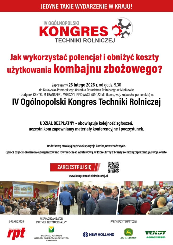 Wydarzenie odbędzie się 26 lutego br. w Minikowie koło Nakła nad Notecią. Więcej informacji oraz rejestracja uczestników znajdują się na stronie kongrestechnikirolniczej.pl.