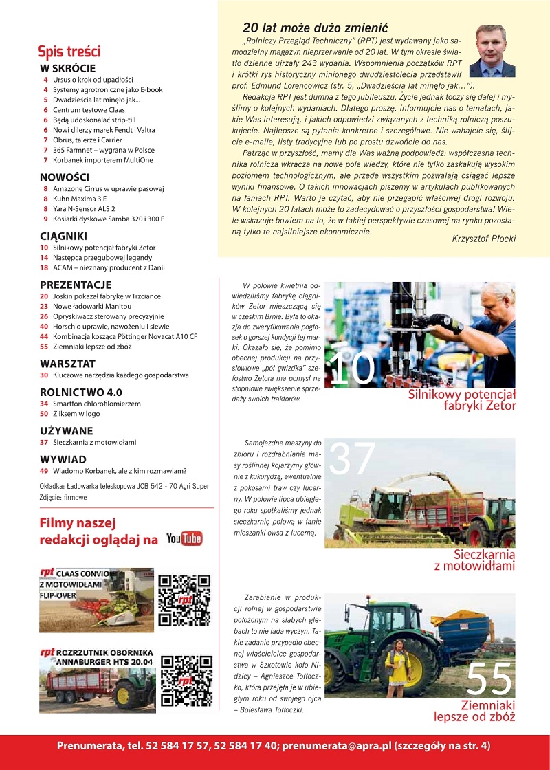 W RPT 5/2019 przeczytacie m.in. o: następcy ciągnik przegubowego Kirowiec, obecnej sytuacji marki Zetor i jej planach na najbliższe lata, nowych ładowarkach Manitou, smartfonie używanym do przygotowania mapy pogłownego nawożenia azotowego, rozwiązaniach koncernu CNH wpisujących się w ramy Rolnictwa 4.0 oraz o rodzajach kluczy od płasko-oczkowych do typu Torx. Zapraszamy do lektury i prenumeraty poprzez płatność elektroniczną