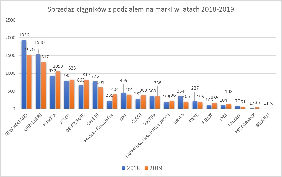 W 2019 r. największy przyrost rejestracji nowych ciągników kupionych w Polsce licząc rok do roku (r/r) w sztukach odnotowały marki: Massey Ferguson (+ 169 szt.), Deutz-Fahr (+ 154 szt.), Kubota (+ 126 szt.) i Claas (+ 101 szt.). Natomiast największe spadki zaliczyły marki: New Holland (‒ 416 szt.), John Deere (‒ 213 szt.), Case IH (‒ 174 szt.) i Ursus (‒ 148 szt.).