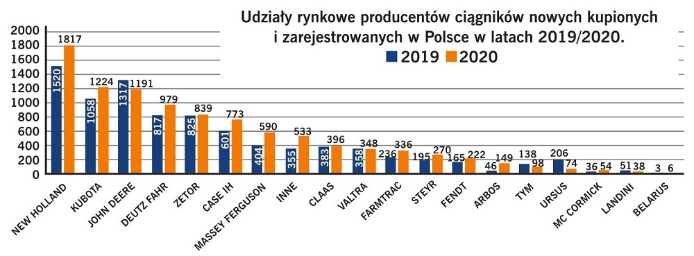 Podsumowując rok 2020, trzy marki przekroczyły liczbę 1000 zarejestrowanych nowych ciągników kupionych w Polsce: New Holland, Kubota i John Deere. Suma nowych traktorów tych producentów wyniosła 4232 szt., co oznacza udziały w rynku z wynikiem ponad 42,5%.
