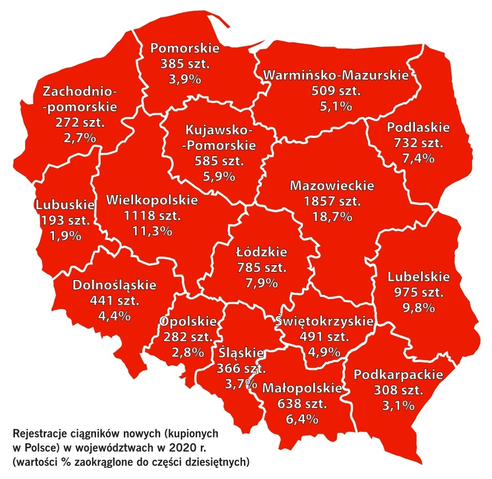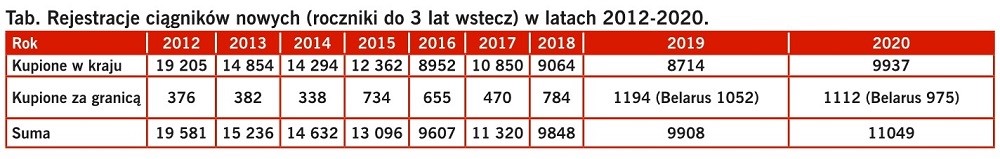 Udział ciągników nowych sprowadzonych z zagranicy z roczników 2018-2020 w całym rynku nowych traktorów wyniósł ponad 11% (w 2019 r. było to ok. 12%). W sumie liczba wszystkich zarejestrowanych w 2020 r. w Polsce traktorów zaliczanych do nowych wyniosła 11049 szt. (tabela powyżej). Na wynik ten ogromny wpływ miały rejestracje odnotowane w czerwcu i lipcu zeszłego roku, których było odowiednio 1005 i 1095. Były to sprzedażowo najlepsze miesiące w całym 2020 r.