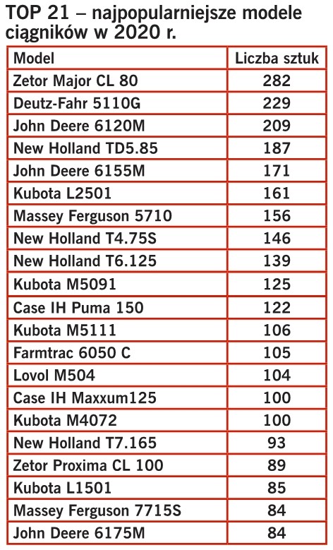 Najpopularniejszym nowym modelem ciągnika kupionym w Polsce w roku 2019 był Zetor Major CL 80. Ten 75-konny traktor zarejestrowany został 282 razy. Drugim najczęściej rejestrowanym nowym ciągnikiem był Deutz-Fahr 5110G, w którym montowany jest silnik o mocy 113 KM. Traktorów tych zarejestrowano 197 sztuk. Trzecie miejsce w tej rywalizacji zajął John Deere 6120M z silnikiem o mocy 120 KM – 209 sztuk. Przypomnijmy, w latach 2020 i 2019 ciągnik ten zajmował w tym zestawieniu miejsce pierwsze.