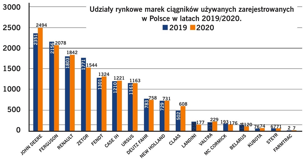 Handel ciągnikami używanymi w 2020 r., porównując r./r. odnotował spadek. W tym przypadku, bez wątpienia przyczyniły się do tego obostrzenia sopodowane pandemią koronawirusa. W zeszłym roku zarejestrowano 16279 szt. Ciągników używanych, czyli o 199 egzemplarzy mniej (1,2%) niż w 2019 r. Najpopularniejszymi markami były: John Deere (2494 szt.), Massey Ferguson (2078 szt.) i Renault (1842 szt.). W kategorii ciągników używanych powyżej 20 lat najczęściej wybierano traktory Massey Ferguson i Zetor, a w pozostałych ciągniki John Deere. Kategoria obejmująca traktory najmłodsze (3-5 lat) była najsłabsza – zaledwie 270 rejestracji.