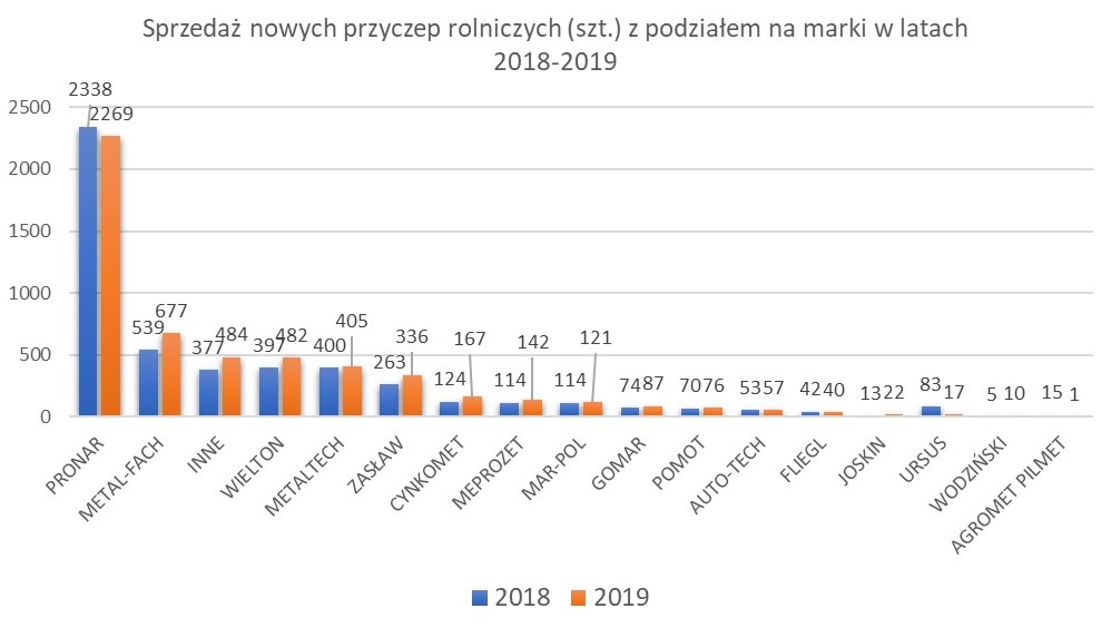 Najpopularniejszym producentem przyczep rolniczych w 2019 roku po raz kolejny został Pronar. Pojazdów tego producenta zarejestrowano 2269 szt. (spadek r/r o 69 szt.), co oznacza 42,1-procentowy udział w rynku. To wynik gorszy niż w 2019 r., w którym miał 46,6%. Drugie miejsce zajął Metal-Fach z 677 rejestracjami (wzrost r/r o 138 szt.), co przełożyło się na 12,6-procentowy udział w rynku. To producenci z Podlasia, odpowiednio z Narwi i Sokółki. Trzecie miejsce w 2018 r. zajął Wielton z wynikiem 482 sprzedanych przyczep rolniczych (wzrost r/r o 85 szt., 8,9% udziału w rynku). Metaltech odnotował 405 szt., co oznacza wzrost r/r o 5 szt. Pierwszą piątkę zamyka Zasław z 336 rejestracjami (wzrost r/r o 73 szt.).