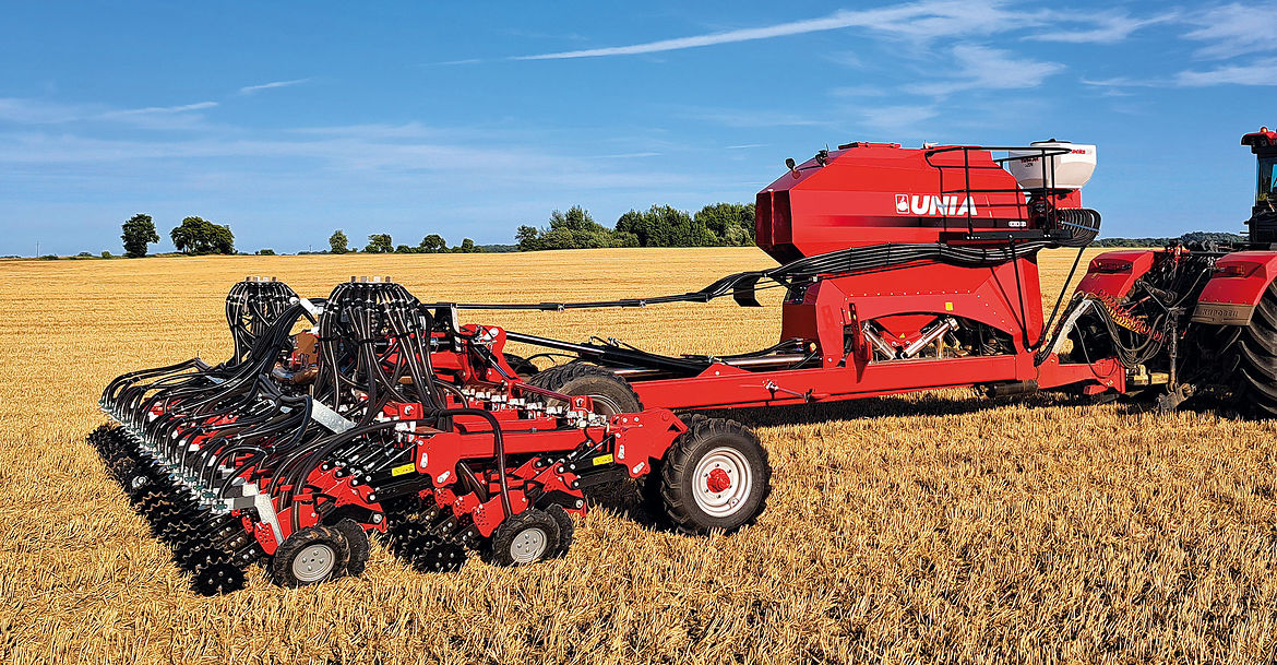 Maszyna o dość wymownej nazwie Notillux będzie dostępna początkowo z szerokościami roboczymi 6 i 8 m oraz nadciśnieniowym zbiornikiem dwukomorowym o pojemności 5000 l (nasiona + nawóz bądź tylko nasiona). Widoczne pod nim cztery aparaty dozujące o dość unikatowej budowie zasilają dwa kanały powietrzne, którymi materiał jest transportowany do dwóch głowic. Zasilają one szynę siewną, wyposażoną w rozstawione co 20 cm redlice jednotarczowe o średnicy 45 cm i nacisku jednostkowym sięgającym 350 kG. Uwagę zwraca m.in. ich zawieszenie na równoległobokach, co pozwala na duży zakres ruchu pionowego przy zachowaniu jednakowej relacji elementów roboczych w ramach sekcji. Do utrzymywania zadanej głębokości siewu służy sąsiadujące z redlicą ogumione koło z bieżnikiem w formie jodełki. Jego szerokość to 10, a średnica całkowita wynosi 40 cm. Opona wypełniona jest pianką poliuretanową. Producent podkreśla zastosowanie koła jodełkowanego jako rozwiązania, które pozwala mu się kręcić w każdych warunkach. Unia zaznacza także ułożenie redlicy, które sprzyja minimalizacji oporów roboczych. Z tego, co udało nam się dowiedzieć, to kąty natarcia i nachylenia nie przekraczają 5°. Zapotrzebowanie mocy określono na 50 KM na każdy metr szerokości pracy. Na końcu każdej sekcji znajdziemy ząbkowane koło zamykające bruzdę siewną. W opcji przed redlicami można zamontować gwiazdowe rozgarniacze resztek roślinnych. Maszyna z oznaczeniem Notillux DD8, czyli o szerokości roboczej równej 8 m, waży na pusto około 10,5 t. Na czas transportu dwa segmenty rampy siewnej składają się do góry i przodu. Ułożone są wówczas wzdłuż dyszla. Do obsługi producent dostarcza zgodny ze standardem ISOBUS terminal Artemis firmy Topcon. Ma on kolorowy dotykowy ekran o przekątnej 7 cali.