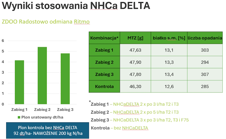 Najwyższa jakość preparatu NHCaDelta zapewnia więc optymalne odżywienie roślin, oszczędności w nawożeniu azotem mineralnym poprzez podniesienie efektywności jego wykorzystania oraz wpływa na lepszy ilościowo i jakościowo plon bez względu na warunki pogodowe.