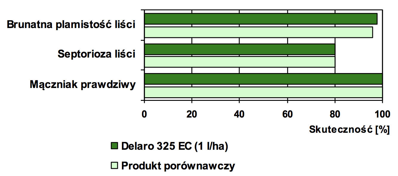 Po wykłoszeniu pszenicy obserwowano wysoce skuteczną ochronę liści przed chorobami zapewnioną przez preparat Delaro 325 EC. Środek ten całkowicie ograniczył występowanie mączniaka prawdziwego, występowanie brunatnej plamistości liści ograniczył w 97,8% a septoriozy liści w 80% (wykres 1).