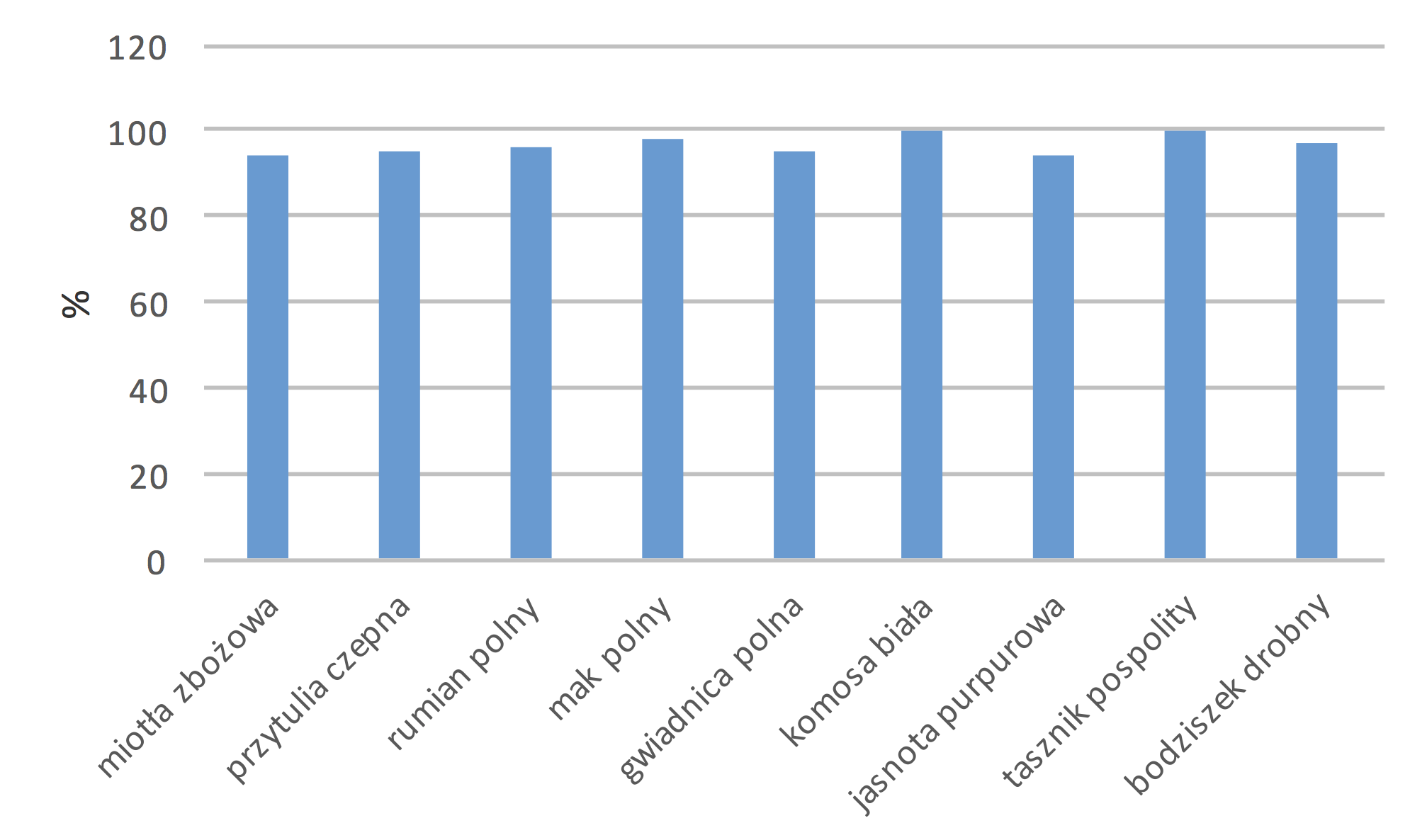 Rys. 1. Skuteczność zwalczania różnych gatunków chwastów w łanie pszenicy ozimej (średnia z czterech eksperymentów zrealizowanych gospodarstwach należących do RZD IUNG PIB Osiny).