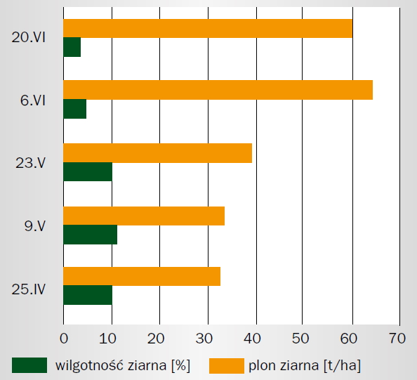 W Katedrze Agronomii Uniwersytetu Przyrodniczego w Poznaniu, prowadzone są badania dotyczące wpływu wybranych czynników agrotechnicznych na wielkość plonu ziarna kukurydzy. Między innymi badana była reakcja odmian bardzo wczesnych na termin siewu. W badaniach tych kukurydzę wysiewano w pięciu różnych terminach, w odstępach 14 dniowych. Pierwszym terminem był 25 kwietnia, pozostałe to: 9 i 23 maja oraz 6 i 20 czerwca. Wyniki badań wykazały, że opóźniony termin siewu kukurydzy, w porównaniu do optymalnego, może w istotny sposób kształtować wielkość plonu ziarna oraz jego wilgotność. Z badań tych jednoznacznie wynika, że największe plony ziarna uzyskano z siewu kwietniowego i siewów majowych (rys. 2). Natomiast plon ziarna dla terminów czerwcowych był o ponad 50 proc. niższy, przy jednocześnie najwyższej zawartości wody w ziarnie, wynoszącej około 60 proc. (rys. 2).
