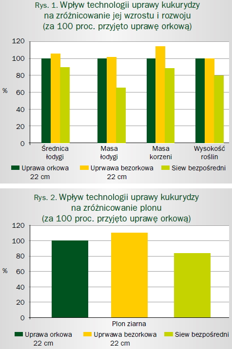 Porównując stan rozwoju kukurydzy stwierdzono, że uprawa bezorkowa wpłynęła na zwiększenie średnicy łodyg (o 6 proc.) oraz masy systemu korzeniowego (o 14 proc.) w porównaniu do uprawy orkowej. Badania nie potwierdziły różnic w masie łodygi oraz w wysokości roślin. Wysiew kukurydzy w nieuprawioną rolę (siew bezpośredni) wyraźnie ograniczył jej wzrost i rozwój. Przeciętna średnica łodyg była mniejsza od stwierdzonej na uprawie orkowej o 11 proc. masa łodyg o 36 proc., masa systemu korzeniowego o 12 proc. natomiast wysokość roślin o 21 proc. Różnice w rozwoju i wzroście roślin stwierdzone w początkowych fazach przełożyły się na wielkość i zróżnicowanie uzyskanego plonu ziarna. Kukurydza uprawiana w technologii orkowej plonowała na poziomie 9,0 t/ha, uprawiana bezorkowo z wykorzystaniem kultywatora osiągnęła plon większy o niemal 10 proc. (9,87 t/ha), natomiast najniższy plon osiągnięto w przypadku siewu bezpośredniego. Wyniósł on 7,46 t/ha i był mniejszy od uzyskanego w uprawie orkowej o 17 proc. (tabela, rys. 1 i 2).
