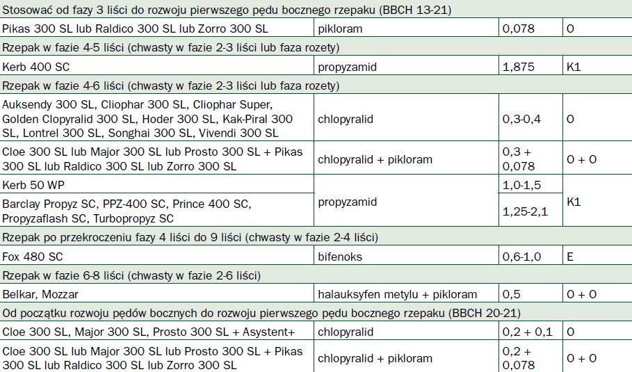 Do stosunkowo późno zalecanych substancji czynnych należy pikloram. Można go stosować od fazy trzech liści do rozwoju pierwszego pędu bocznego rzepaku (BBCH 13-21) Zalecany jest w dawce 0,078 l/ha. Również dość późno (BBCH 14-16) zalecany jest chlopyralid. Środki te można stosować pojedynczo, ale wiele kombinacji ma rejestrację łącznego stosowania, także w rozszerzonych kombinacjach, np. z dodatkiem aminopyralidu w formie mieszanin fabrycznych (Astor 360 SL, Blast, Iguana, Kratos Trio, Mariner 360 SL, Navigator 360 SL) lub w wielu wariantach mieszanin zbiornikowych z metazachlorem. Całość uzupełniają dwie specyficzne substancje czynne. Pierwsza to propyzamid (Kerb i odpowiedniki) charakteryzujący się działaniem doglebowym, a stosowany wyłącznie nalistnie w fazie 4-6 liści rzepaku na chwasty w fazie rozet. Cechą charakterystyczną tej substancji czynnej jest najbardziej efektywne działanie w temperaturze 0-15oC. Drugą specyficznie działającą substancją czynną jest bifenoks (Fox 480 EC). To preparat głównie o działaniu kontaktowym. Z tego powodu nie może być stosowany wcześniej niż po całkowitym wykształceniu przez rzepak czterech liści właściwych, ale może być aplikowany do dziewiątego liścia. Przeznaczony jest do niszczenia chwastów nieprzekraczających fazy czterech liści.