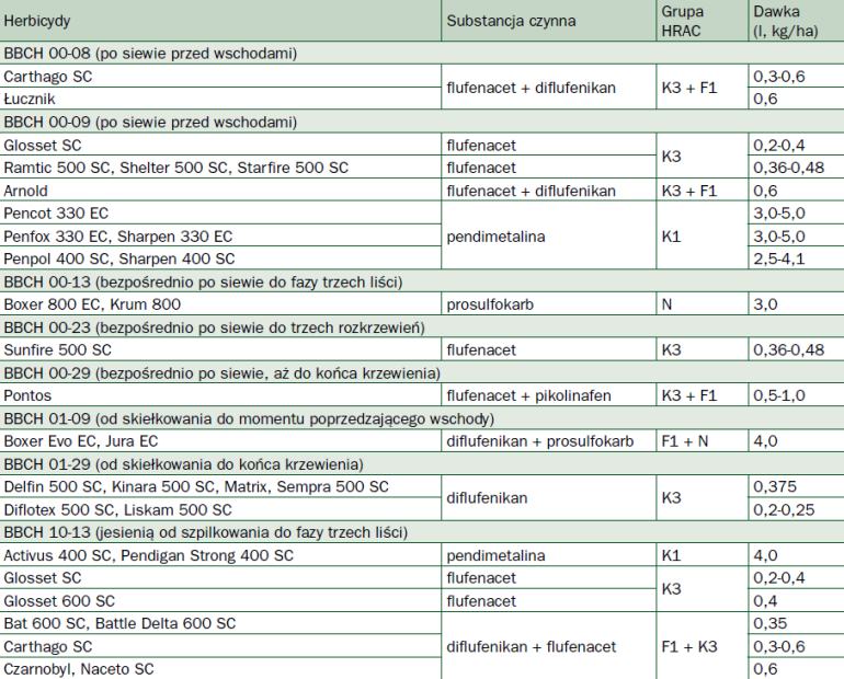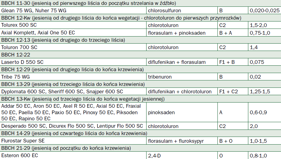 Preparat Beeflex 500 SC (beflubutamid) zalecany jest w dawce 0,25-0,5 l/ha. W dawce niższej zwalcza niektóre gatunki dwuliścienne, w wyższej dodatkowo skutecznie miotłę zbożową. Analogiczne preparaty Axial Komplett i Axial One 50 EC to fabryczna mieszanina pinoksadenu (tylko jednoliścienne) i florasulamu (tylko dwuliścienne). Dość istotną cechą florasulamu jest jego skuteczność na chwasty w fazie sześciu liści właściwych i dość silny destrukcyjny wpływ na chwasty starsze, które mogą nawet zamierać, ale nie wcześniej niż po upływie czterech, a nawet sześciu tygodni.