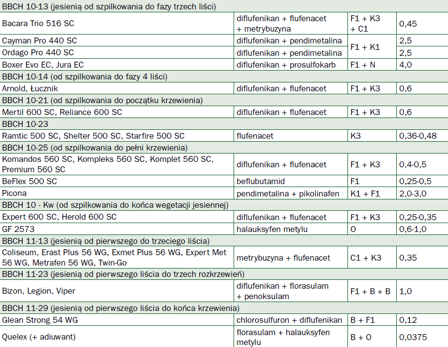 Ponad połowę programu stanowią kombinacje herbicydowe z udziałem diflufenikanu i flufenacetu. Sam diflufenikan jest zalecany najrzadziej. Preparaty: Delfin 500 SC, Kinara 500 SC, Matrix i Sempra 500 SC należy stosować głównie na stanowiskach, na których, spodziewane są takie gatunki jak: fiołek polny, gwiazdnica pospolita, jasnota purpurowa, maruna nadmorska, przetacznik perski, przytulia czepna, rumianek pospolity i tasznik pospolity. Diflufenikan w pewnym stopniu ogranicza i hamuje też rozwój miotły zbożowej. Stąd jest bardzo dobrym „partnerem” dla substancji czynnych, które niszczą ten gatunek, bo znacznie wspiera ich działanie. Jednocześnie warto wiedzieć, co nie jest zamieszczane w etykietach, że diflufenikan skutecznie zwalcza wyczyniec polny.