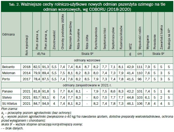 Tab. 2. Ważniejsze cechy rolniczo-użytkowe nowych odmian pszenżyta ozimego na tle odmian wzorcowych, wg COBORU (2018-2020)
