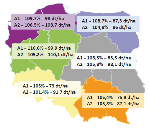 Dane plonowania z 12 stanowisk na terenie całej Polski (COBORU, zbiór w latach 2013, 2014, 2015, poziom A1 – bez fungicydów i regulatorów wzrostu, A2 – ochrona fungicydowa i regulacja wzrostu):